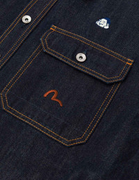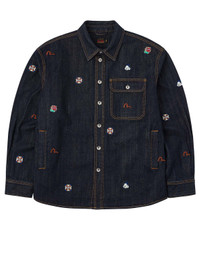 2EAHTM5SJ1044XXDN This denim shirt jacket showcases EVISU's exquisite craftsmanship with its unique playful theme and rich embroidery elements. The jacket is adorned with a variety of embroidered patterns, including the Godhead, Seagull, and Kamon, reflecting the brand's classic features and cultural significance while enhancing visual appeal and creativity - Regular fit - 100% Cotton - Allover brand embroidery - Button fastening, 3 pockets