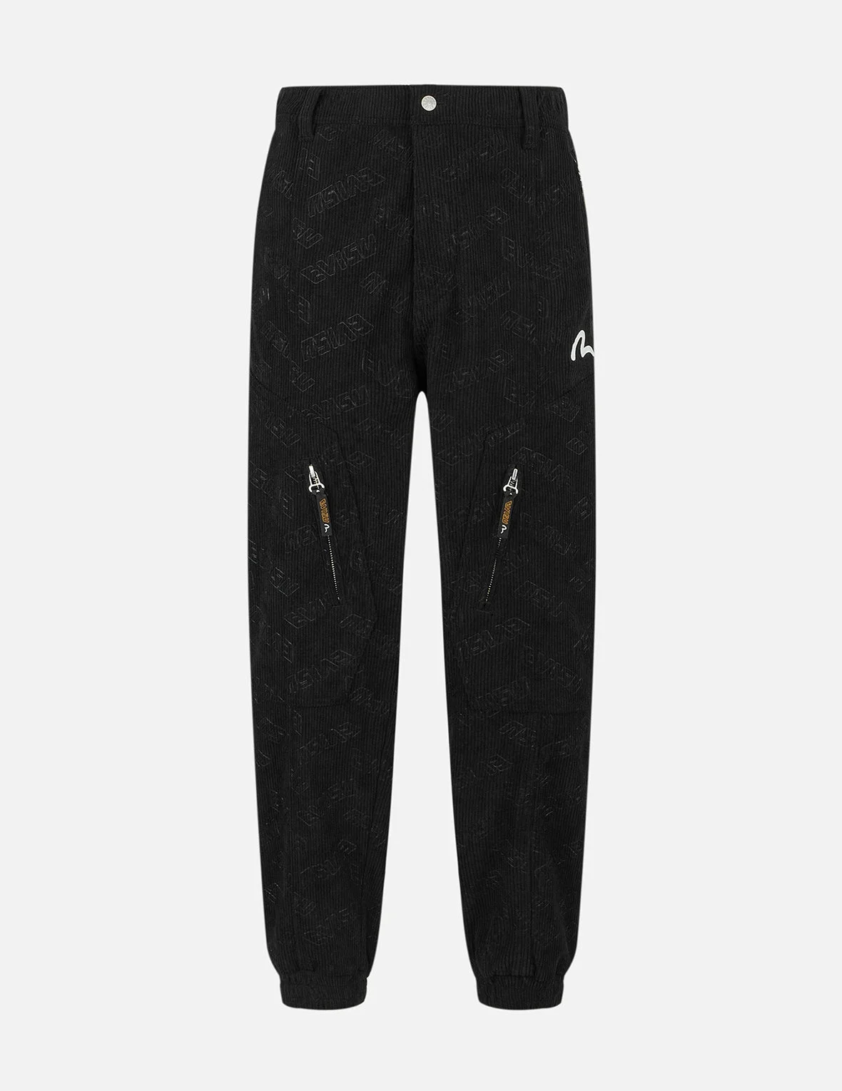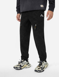 2EAHTM4PO8037RXCD These woven joggers feature an allover EVISU deboss print and Seagull embroidery, showcasing the brand's unique design style. As a signature piece from the brand's designer, they are not only comfortable and practical but also perfect for casual wear, seamlessly blending fashion and functionality. - Relax fit - 100% Corduroy - Allover EVISU deboss print and Seagull embroidery - EVISU Premium Quality Kamon tag - Zip fly, elasticated cuffs, 4 pockets