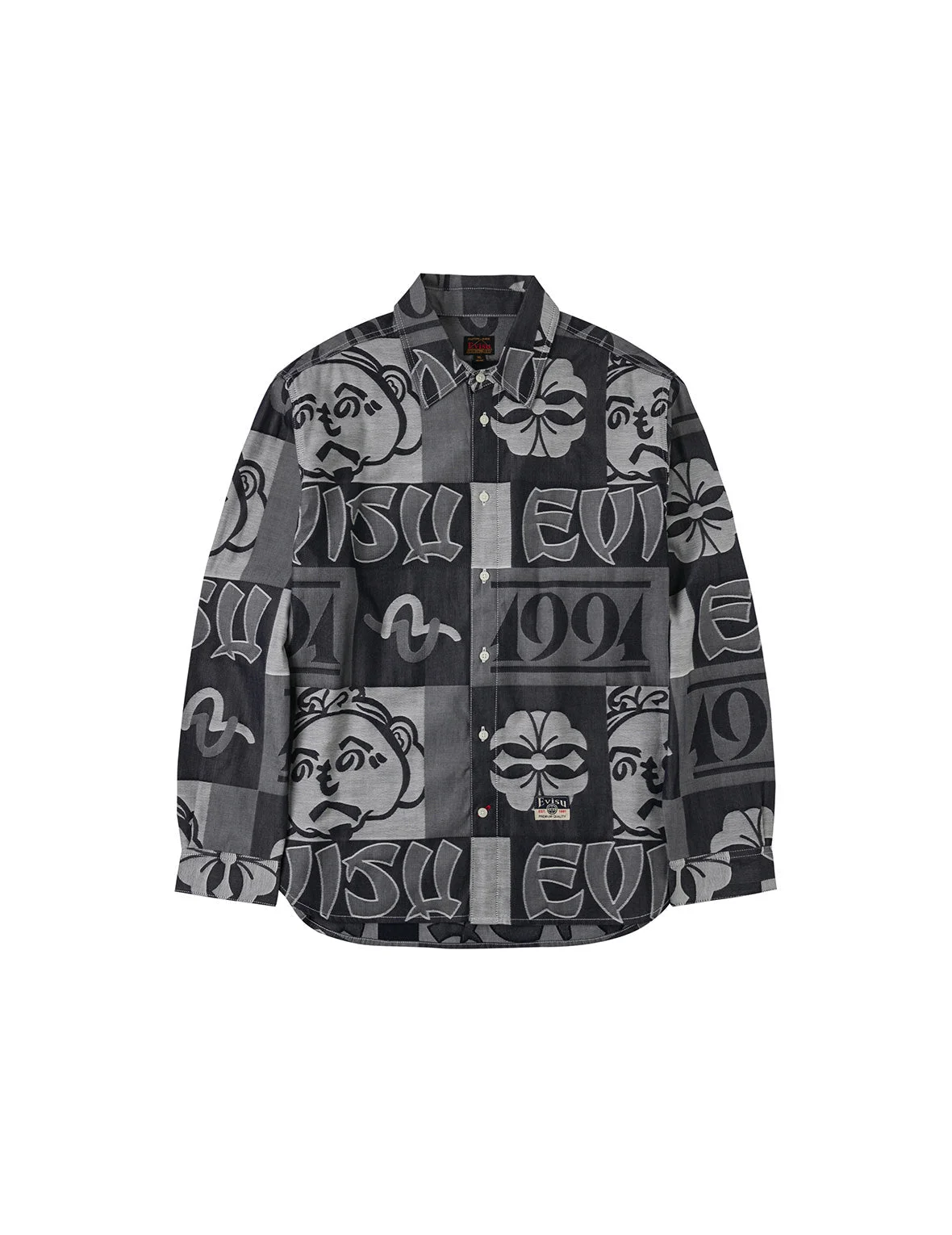 2EAHTM5DL1118RXDN This denim shirt stands out with its unique blend of allover Henohenomohe Godhead illustrations, logo, seagull and intricate Kamon jacquard! The Godhead is infused with playful Japanese text, creating a lively and whimsical vibe, complemented by the brand's iconic EVISU logo and refined Kamon jacquard, delivering a rich, layered texture that seamlessly weaves together avant-garde style and cultural flair. - Relax fit - 100% Cotton - Allover Henohenomohe Godhead, seagull, Kamon and logo jacquard - Button fastening - EVISU Premium Quality Kamon tag