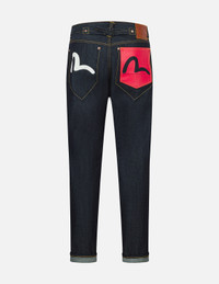 2ESHTM5JE700717CT With a unique and fashionable design, these jeans are a true standout. The back pockets are a focal point: the left side sports a faux pocket for a minimalist vibe, while the right side shines with a vivid red hue and a bold seagull print, adding an instant dose of personality and vibrancy to your look. - 2017 Carrot fit - 100% Cotton - Seagull print - Button fly, 5 pockets - Godhead leather patch