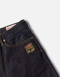 2EAHTM5JE105320DN This classic denim jean blends traditional brocade artistry with fine craftsmanship, featuring a Daicock pattern and signature embroidery at the back for unique style. Made from premium Indigo denim with golden threads and intricate patterns, it offers a luxurious yet modern streetwear edge. Tailored for a perfect fit with durable details, it's a must-have for Fall 2025. - 2000 Regular fit - 100% Cotton - Brocade inserted Daicock with logo embroidery - Button fly, 5 pockets - EVISU Japanese Kamon tag - Godhead leather patch