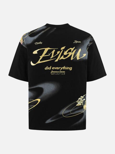 2ESHTM5TS1216RXCT Brocade is the brand’s quintessential Japanese signature. The designer artfully weaves Kamon into the fabric, intertwining an array of lustrous metallic threads to craft a striking, one-of-a-kind shimmer. Scattered clouds, the golden EVISU logo, and seagull and slogan prints elevate the depth, lending an unmistakable touch of opulence to the overall aesthetic. - Relax fit - 100% Cotton - Brocade Kamon - Allover scattered clouds, EVISU logo, seagull and slogan prints
