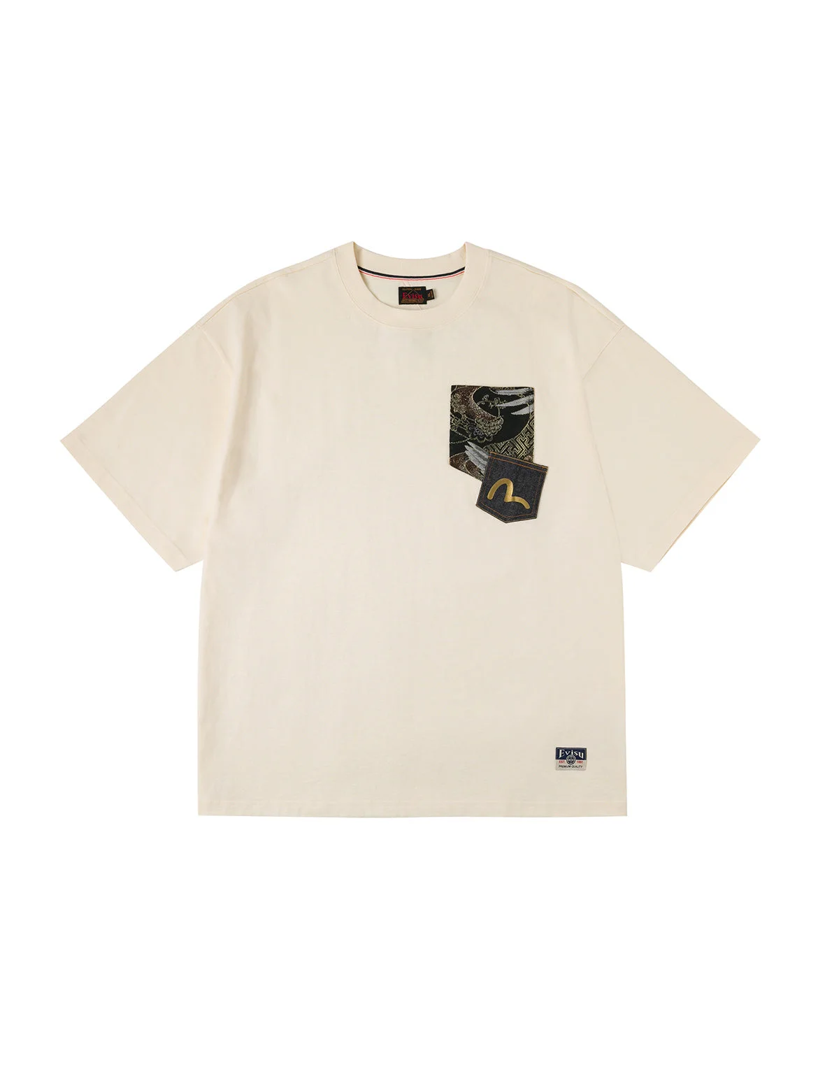 2EAHTM5TS1179LFCT This stylish T-shirt shines with it's standout brocade pocket up front, where intricate patterns team up with a gold-foil seagull, blending in this season’s exclusive brocade design for a cool mix of understated luxury and artsy vibes. Slip it on, and you’ll effortlessly steal the spotlight, showing off a chill fusion of luxe details and your personal charm! - Loose fit - 100% Cotton - Brocade pocket with seagull foil print - Logo print - EVISU Premium Quality Kamon tag