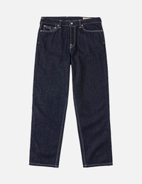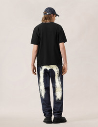 2ESHTM6JE104630DN This pair of jeans showcases EVISU’s iconic Daicock in an oversized brushstroke at the back, turning the entire rear panel into a bold canvas. The raw, painterly strokes contrast against the deep indigo denim, delivering an artistic street statement that is instantly recognizable from every angle. - Relax fit #2030 - 77% Cotton, 23% Hemp - Brushstroke Daicock - Button fly, 5 pockets