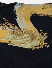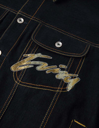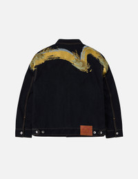 2EAHTM5DJ1022LFDN This denim jacket is a game-changer in the world of fashion, exuding a bold and untamed personality! Featuring a loose fit silhouette, it showcases intricate logo embroidery on the front pocket, highlighting the brand's unique identity. The back design steals the show with a striking classic brushstroke Daicock, elevated by the designer with wave embroidery for an explosive three-dimensional effect and a powerful visual impact. - Loose fit - 100% Cotton - Brushstroke Daicock print with wave embroidery - Logo embroidery - Button fastening, 4 pockets - Godhead leather patch