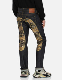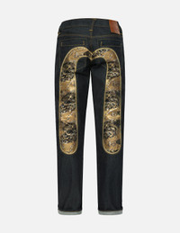 2EAHTM4JE701208DP The back of EVISU jeans features a prominent black and gold embroidered Daicock design, adorned with elegant crane motifs, showcasing the essence of Japanese aesthetics. The luxurious pattern exhibits rich layers and delicate coloration, adding a touch of grandeur and sophistication to the garment. FIT & STYLING: 2008 REGULAR CARE HAND WASH COLD INSIDE OUT MILD DETERGENT DO NOT BLEACH HANG DRY ONLY COOL IRON ON REVERSE SIDE IF NEEDED STEAM IRONING MAY CAUSE IRREVERSIBLE DAMAGE DO NOT DRY CLEAN