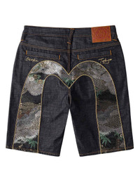 2ESHTM6DS1137XXDN These denim shorts combine EVISU’s classic American street style with Japanese craftsmanship. Featuring refined brocade in the signature Daicock motif plus “Osaka” and “Tokyo” embroideries, the intricate details elevate their sophistication. - Regular fit - Shell: 100% Cotton; Trims: 100% Polyester & Polyester film fiber; Pockets: 83% Polyester, 17% Cotton - Daicock brocade - “Osaka” & “Tokyo” embroideries - Button fry, 5 pockets