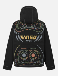 2ESHTM5JK1163RXSN With a relaxed fit, this hooded jacket incorporates distinctive stitching details, creating a seamless fusion of style and personality. The back features 2 Daruma prints paired with a gold logo applique, enhancing its bold aesthetic. The design is both modern and functional, perfect for everyday wear or casual events to showcase your unique flair. - Relax fit - 85% Polyester, 15% Cotton - Contrast stitching - Daruma print and logo applique - Zip fastening, 2 pockets - EVISU Premium Quality Kamon tag