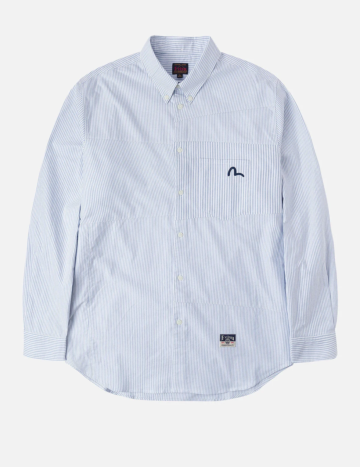 2EAHTM5SL1107RXCT This shirt features a deconstructed design with a relaxed fit, perfect for casual wear. The classic striped pattern is enhanced by iconic seagull embroidery and EVISU logo print, adding a unique fashionable touch. Ideal for creating a laid-back yet trendy look. - Relax fit - 100% Cotton - Seagull embroidery and logo print - Button fastening - EVISU Premium Quality Kamon tag