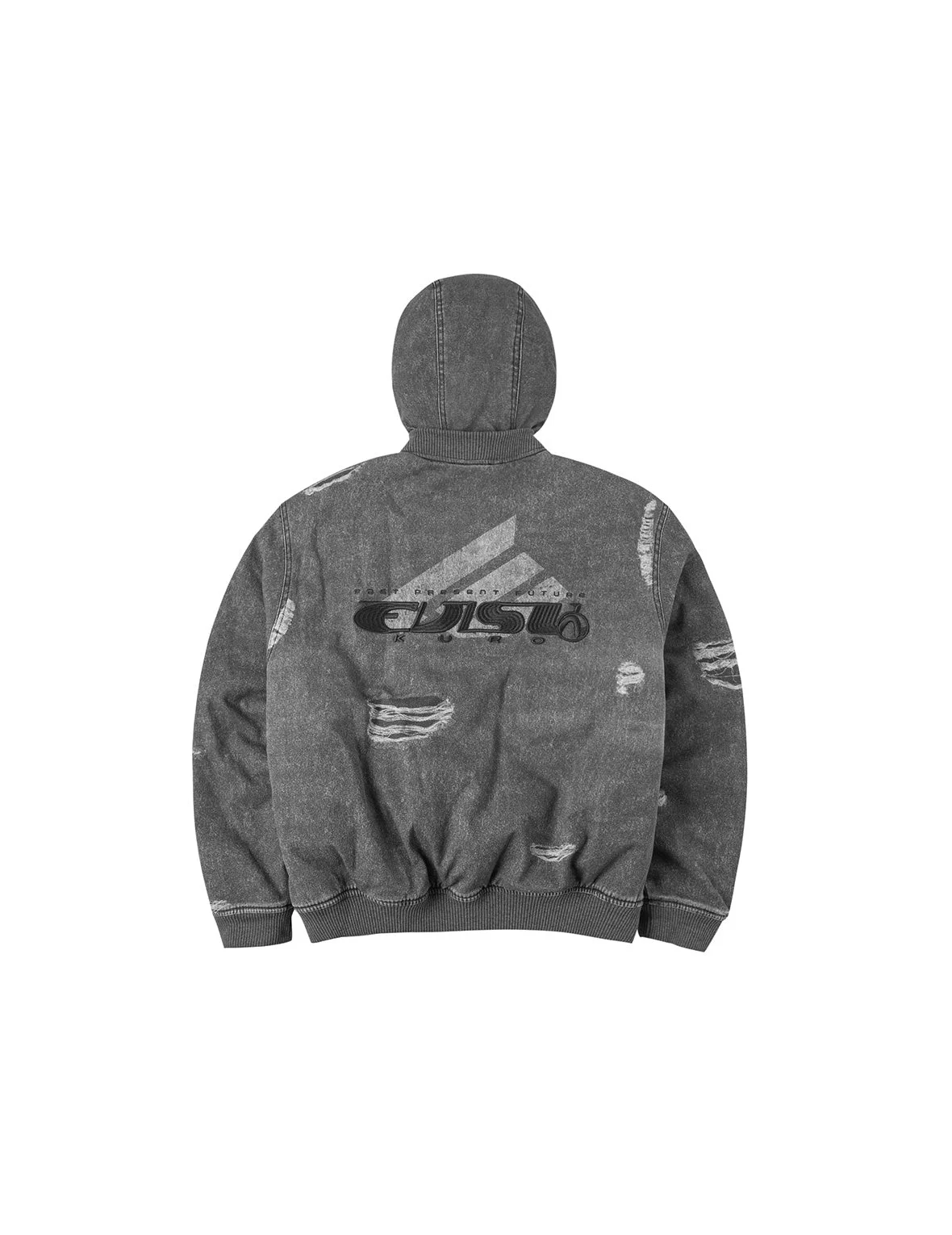 Distressed Print with Logo Embroidery Loose Fit Padded Boomer Jacket