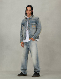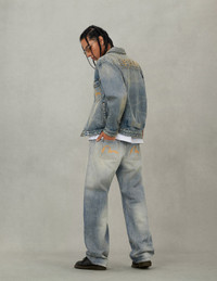 2EAEJM5DJ6001RXDN Inspired by the 1940s, this EVISU denim jacket features a distressed Seagull print, hollow button style, washed details, and frayed EVISU patch embroidery, creating a strong retro atmosphere. - Relax fit - 100% Cotton - Distressed Seagull print - Frayed logo patch embroidery - Button fastening, 4 pockets