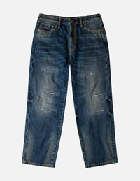 2EAGDM5JE6431RXDN Explore the EVISU X GDC collaboration jeans, a perfect blend of vintage American street style and modern flair. The distressed details add unique charm, while the back features a striking Daicock print alongside GDC's iconic star pattern and the slogan "A Rolling Stone Gathers No Moss," symbolizing freedom and adventure for those who embrace a carefree lifestyle. - Relax fit - 100% Cotton - GDC star and slogan Daicock print - Distressed details - Button fly, 5 pockets