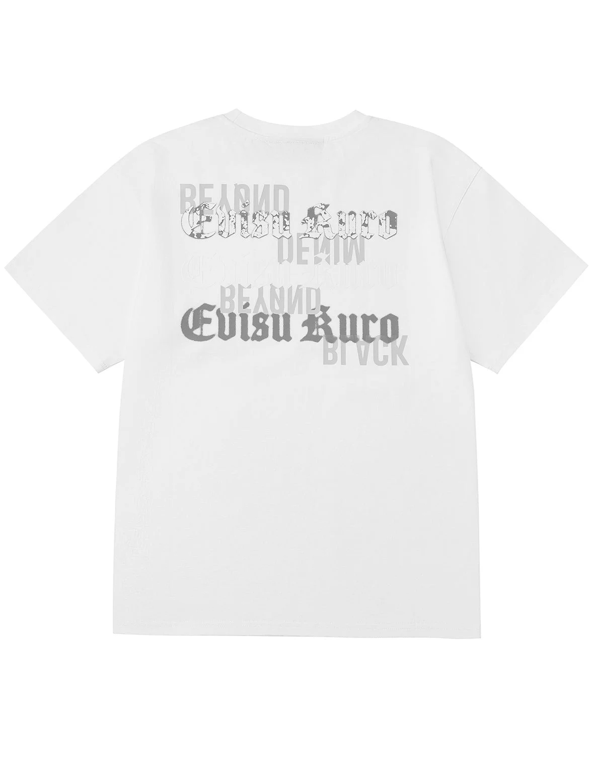 2EAGNM5TS5033XXCT This stylish new masterpiece from EVISU features a T-shirt that combines the EVISUKURO logo and slogan with flocking and plastisol print, showcasing a unique interplay of different shades. The distinctive design exudes fashion and individuality, making it perfect for those who seek a unique style. - Regular fit - 100% Cotton - EVISUKURO logo and slogan with flocking and plastisol print