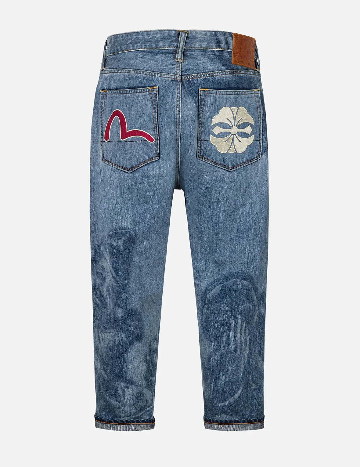 2ESHTM5JE102627DN With a fisherman Godhead print as the centerpiece, these cropped jeans employ cutting-edge laser technology to achieve strikingly realistic patterns, reflecting a unique artistic vibe. The light wash finish adds a vintage touch and layered dimension, perfectly showcasing Japanese charm. The red seagull and Kamon applique on the pockets bring a touch of personality, making them a versatile and stylish choice to pair with any casual T-shirt. - 2027 Cropped fit - 100% Cotton - Fisherman Godhead laser print - Seagull and Kamon applique pockets - Button fly, 5 pockets - Godhead leather patch