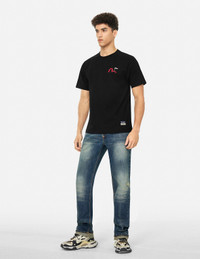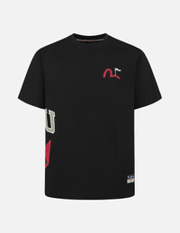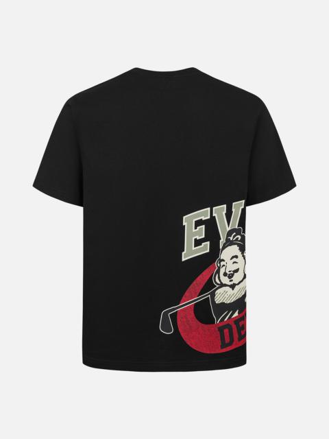 2ESHTM5TS1122XXCT EVISU employs a retro printing technique, featuring a Seagull and golf flag design on the front of this T-shirt, showcasing a unique classic style. The side waist incorporates the brand's logo, with the Godhead image holding a golf club, as if ready to swing at any moment, adding a playful and personalized touch. - Regular fit - 100% Cotton - Seagull, logo, flag, and Godhead golfing print
