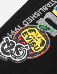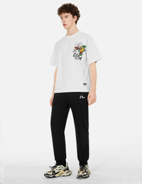 2ESHTM5SP1091XXCT This pair of sweatpants features a unique design that catches the eye, with the brand's classic Seagull print on the front. The back boldly showcases a graffiti-style Daicock print with a Godhead, created using a variety of EVISU stickers and printed text, evoking a strong street culture vibe. - Regular fit - 100% Cotton - Godhead graffiti Daicock print - Seagull print - Elasticated waistband and cuffs, 3 pockets