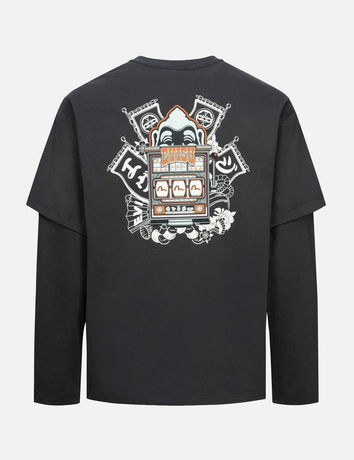 2EAHTM4TL8052LFCT This EVISU T-shirt features a zipper chest pocket and a seagull graphic print on the front, creating a casual, sporty aesthetic. In contrast, the back displays a large Godhead slot machine print, blended with Japanese flag motifs and festival elements, exuding a strong Eastern cultural vibe. This makes it a one-of-a-kind trendy piece. FIT & STYLING: LOOSE CARE MACHINE WASH COLD INSIDE OUT DELICATE CYCLE DO NOT BLEACH HANG DRY ONLY COOL IRON ON REVERSE SIDE IF NEEDED STEAM IRONING MAY CAUSE IRREVERSIBLE DAMAGE DO NOT DRY CLEAN DO NOT IRON ON PRINT