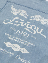 2ESHTM5DI1200FFDN Combining sporty elements with denim aesthetics, this baseball shirt features a back design that includes the brand slogan, Kamon and a fresh logo font. The addition of the mythical Hakutaku print, representing luck and protection, adds layers of traditional Japanese opulence, making you a standout in any occasion. - Fashion fit - 100% Cotton - Slogan, Kamon, Logo and Hakutaku prints - Button fastening - EVISU Premium Quality Kamon tag