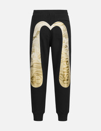 2ESHTM5SP1079XXCT The new season of EVISU draws inspiration from the auspicious mythical creature Hakutaku, featuring a Daicock pattern that showcases the majestic figure of Hakutaku gracefully navigating through valleys and gorges. The design cleverly incorporates elements from EVISU and Kamon, imbuing the overall look with unique cultural depth and individual charm. - Regular fit - 100% Cotton - Logo and Hakutaku Daicock print - Elasticated waist and cuffs, 4 pockets