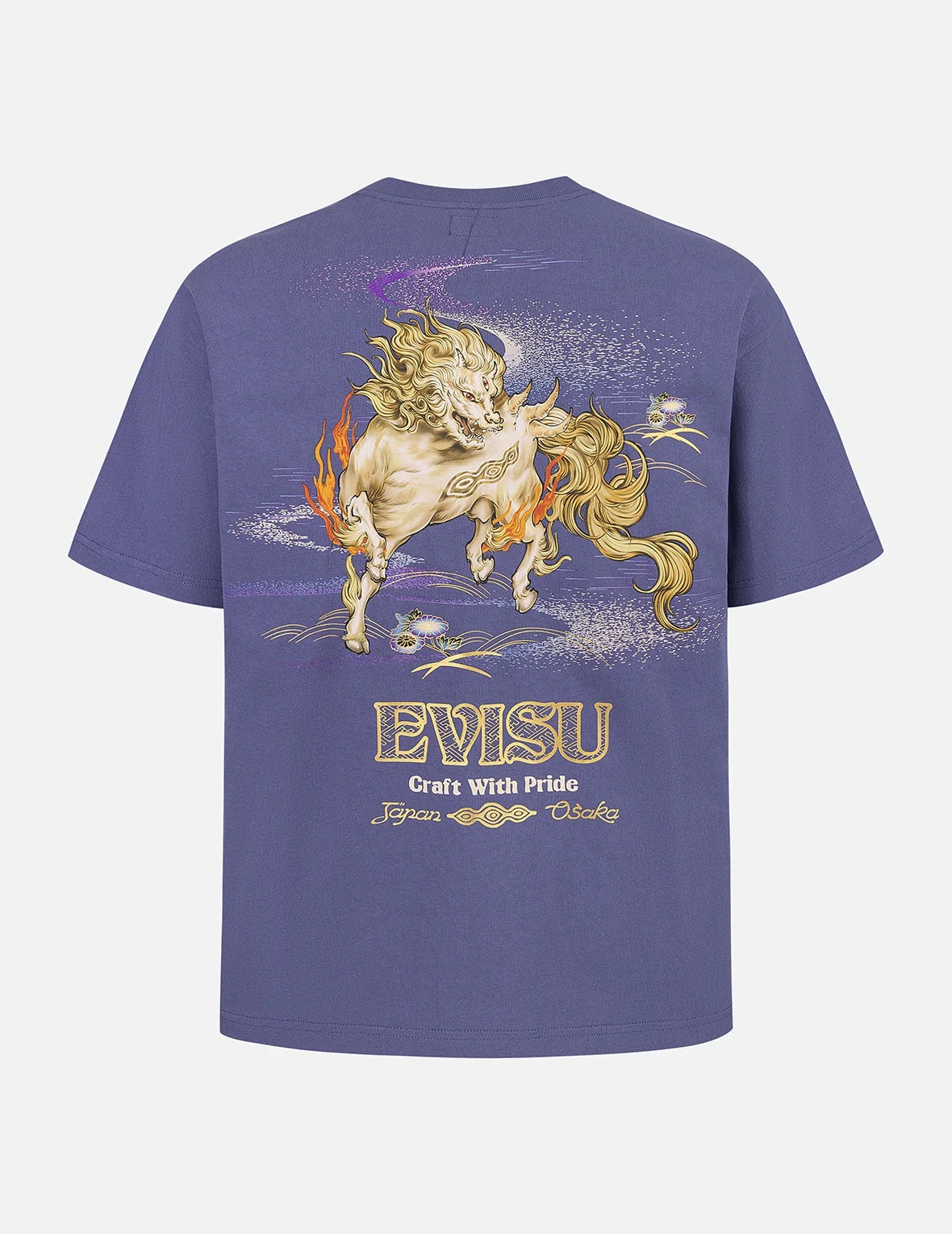 2ESHTM5TS1096RXCT The new EVISU collection is themed around the auspicious mythical creature that brings good fortune—Hakutaku. It has the body of a bull and the head of a lion, with horns on its back, eyes on the sides of its torso and on its forehead, and hooved feet, all covered in thick white fur. This T-shirt features a richly textured Hakutaku print, along with the brand logo and the Wheel of Wisdom. - Relax fit - 100% Cotton - Hakutaku, logo and the Wheel of Wisdom print