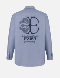 2ESHTM5SL1073RXCT Featuring a mix of half-Kamon embroidery and print designs, this oversized casual long-sleeve shirt offers a unique and stylish appeal. The chest pocket is embellished with an intricate seagull pattern, while the back displays a striking slogan, elevating its individuality and brand recognition. Designed for comfort, it’s ideal for various casual occasions, whether paired with jeans or casual pants, effortlessly creating a chic and modern look. - Relax fit - 100% Cotton - Half-Kamon embroidery and print - Seagull and slogan print - Button fastening, 2 pockets - EVISU Premium Quality Kamon tag