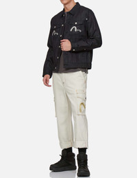 2EAGNM1DJ275XXCT A masterpiece of Japanese art and craftsmanship, this denim jacket is defined by an intricate print, composed by a Sashiko pattern, cast shadow effect Kamon and Hannya graphics and a plethora of slogans, to put you at the center of attention. - 100% Cotton - Regular fit - 12oz raw denim - Seagull prints - Hannya and Kamon collage print - 4 pockets - Signature logo leather badge