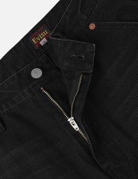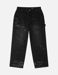 2ESEJM6PT6006RXCT EVISU’s heavy-washed black jeans exude rugged character: distressed splatters complement the bold flame-detailed daicock, while the cuffs feature layered washed texture for a lived-in finish. The relaxed fit and utility pockets balance worn-in charm with statement style. - Relaxed fit - 100% Cotton - Layered washed texture at hems and distressed finish - Flame-detailed daicock - Utility pocket design; 7 pockets - Zipper closure style