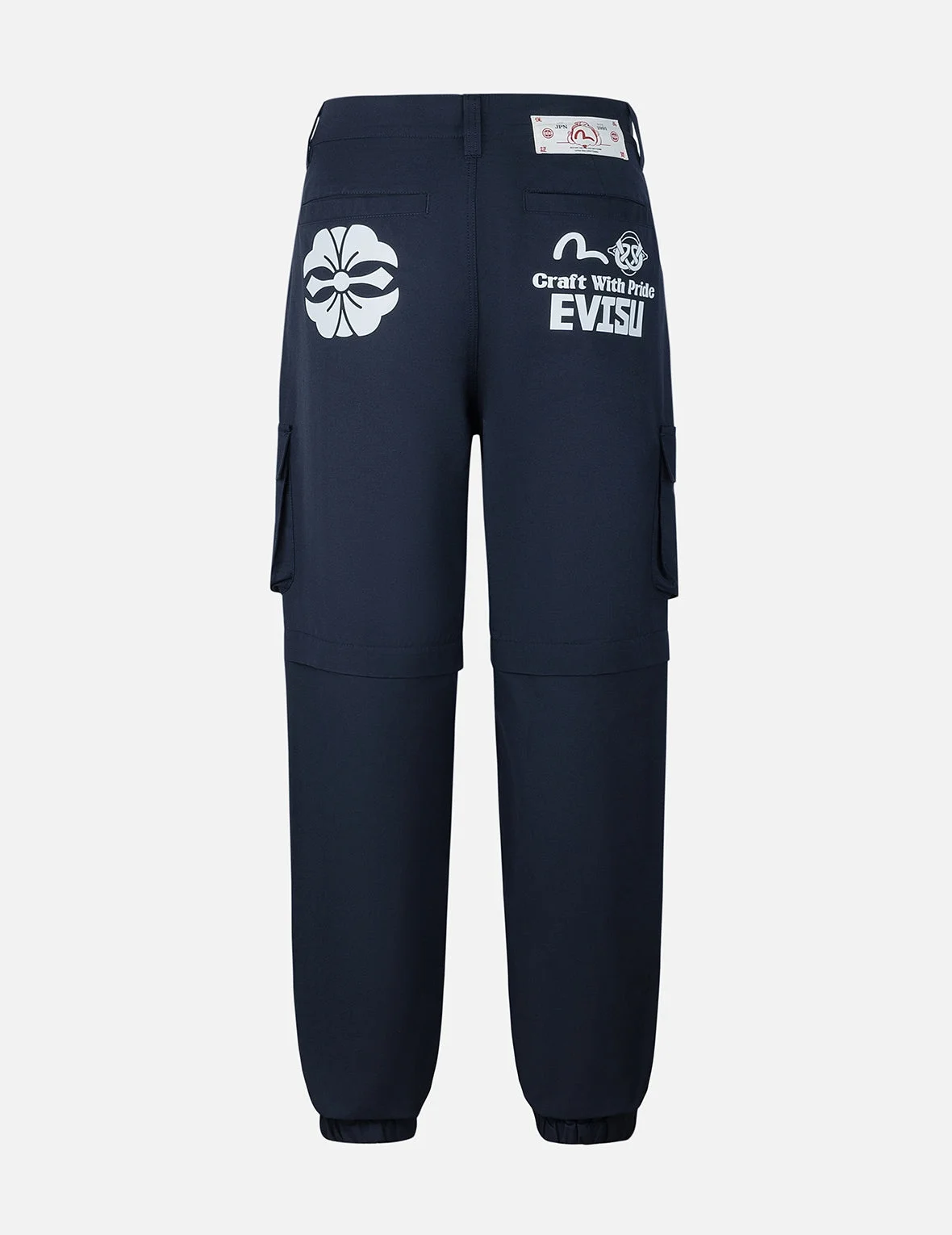 2ESHTM5PO1192FFCP Breaking from conventional rugged styles, these detachable cargo joggers are crafted from lightweight cotton canvas, merging workwear practicality with a modern, fashionable cut. The unique Kamon and logo prints add a touch of detail and character. The woven tapered design allows for diverse streetwear outfits, blending traditional and contemporary elements effortlessly. - Fashion fit - 62% Cotton, 38% Polyester - Kamon, Seagull and EVISU logo prints - Elasticated cuffs, 6 pockets, zip fly - EVISU Premium Quality Kamon tag