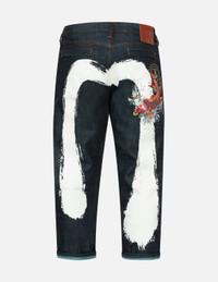 2ESHTM4JE703527DN This pair of cropped jeans from EVISU stands out with its remarkable brushstroke Daicock and exquisite embroidery. The vibrant gold-threaded Kamon and koi fish playing in water embroidery details bring the EVISU's craftsmanship and artistic elements to life. FIT & STYLING: 2027 CROPPED CARE HAND WASH COLD INSIDE OUT MILD DETERGENT DO NOT BLEACH HANG DRY ONLY COOL IRON ON REVERSE SIDE IF NEEDED STEAM IRONING MAY CAUSE IRREVERSIBLE DAMAGE DO NOT DRY CLEAN DO NOT IRON ON PRINT