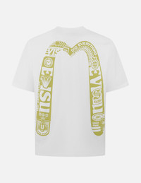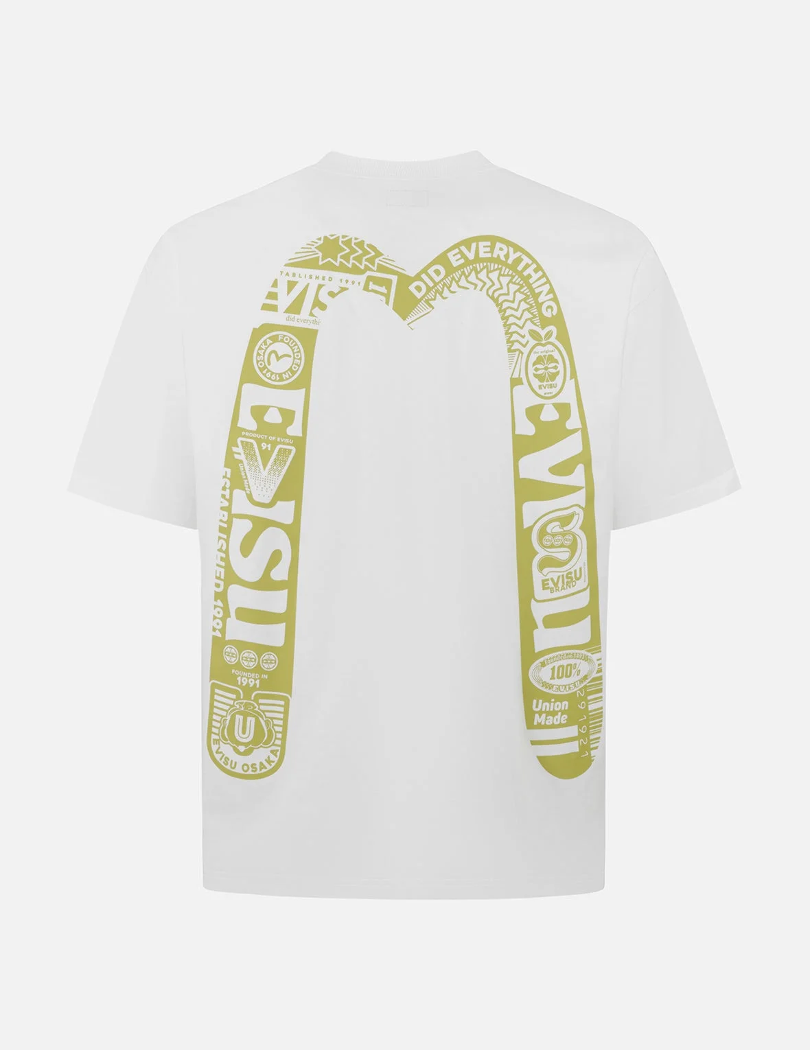 2ESHTM5TS1231LFCT This T-shirt weaves in the classic logo, a testament to the brand’s unwavering identity and seamless flair. With familial Kamon, seagulls, and the emblem artfully tucked into a striking Daicock design, it bursts forth with fresh creative energy, perfectly capturing the brand’s unique charm and fashion-forward pulse. - Loose fit - 100% Cotton - Kamon, Seagull and logo Daicock print - EVISU Premium Quality Kamon tag
