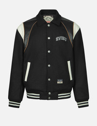 2EAHTM4JK1022RXWQ When temperatures drop suddenly, this baseball jacket is your essential warmth companion. The jacket is made from high-quality wool, with faux leather accents and details that create a unique layered effect. The front features a contrasting brand logo embroidery, while the back showcases a logo and seagull patch embroidery. The overall design combines comfort with a stylish flair. - Fashion fit - 60% Wool, 40% Polyester - Logo embroidery, logo and Seagull applique - Snap button fastening, striped ribbed trim - 2 pockets