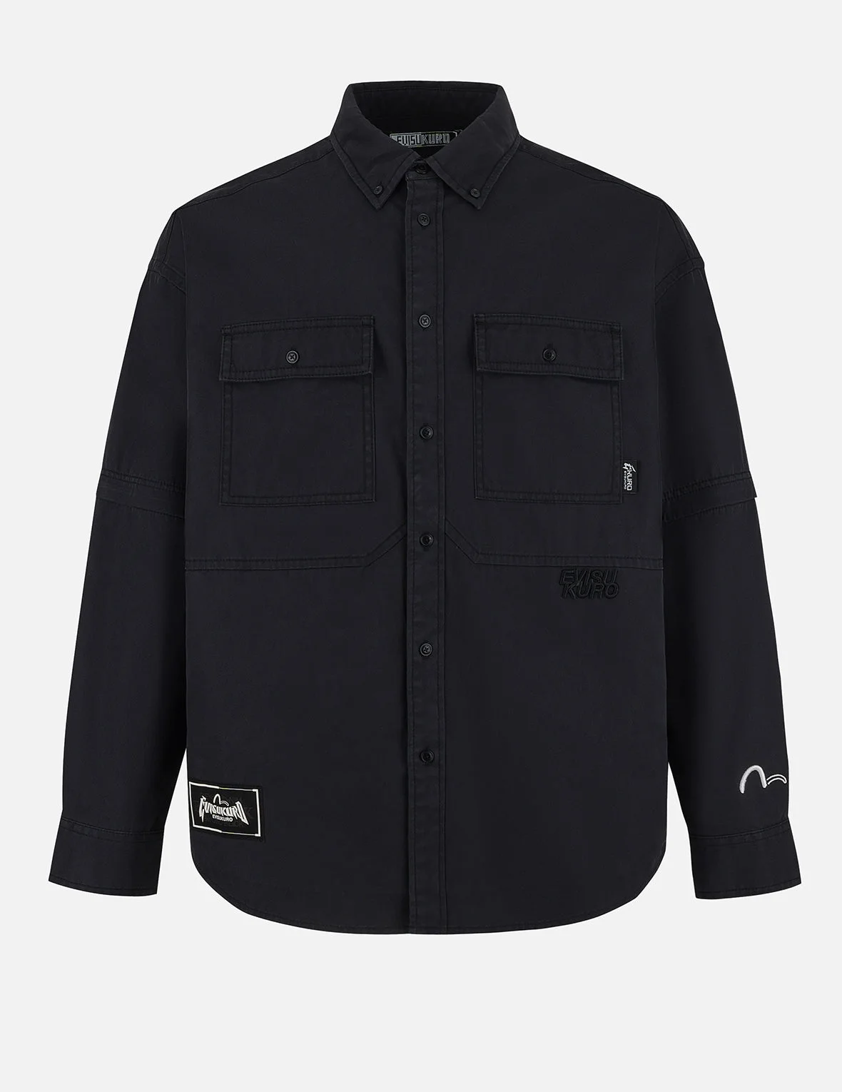 2ESGNM5SJ5026LFCT Designed with detachable sleeves, this black shirt jacket stands out for its versatility and unique style. The front showcases a delicate EVISUKURO logo and seagull embroidery, highlighting personalized brand touches. The timeless black hue ensures effortless pairing, making it a perfect blend of fashion and functionality, whether layered or worn solo. - Loose fit - 77% Cotton, 23% Polyamide - Detachable sleeves design - EVISUKURO logo and seagull embroidery - Button fastening, 2 pockets