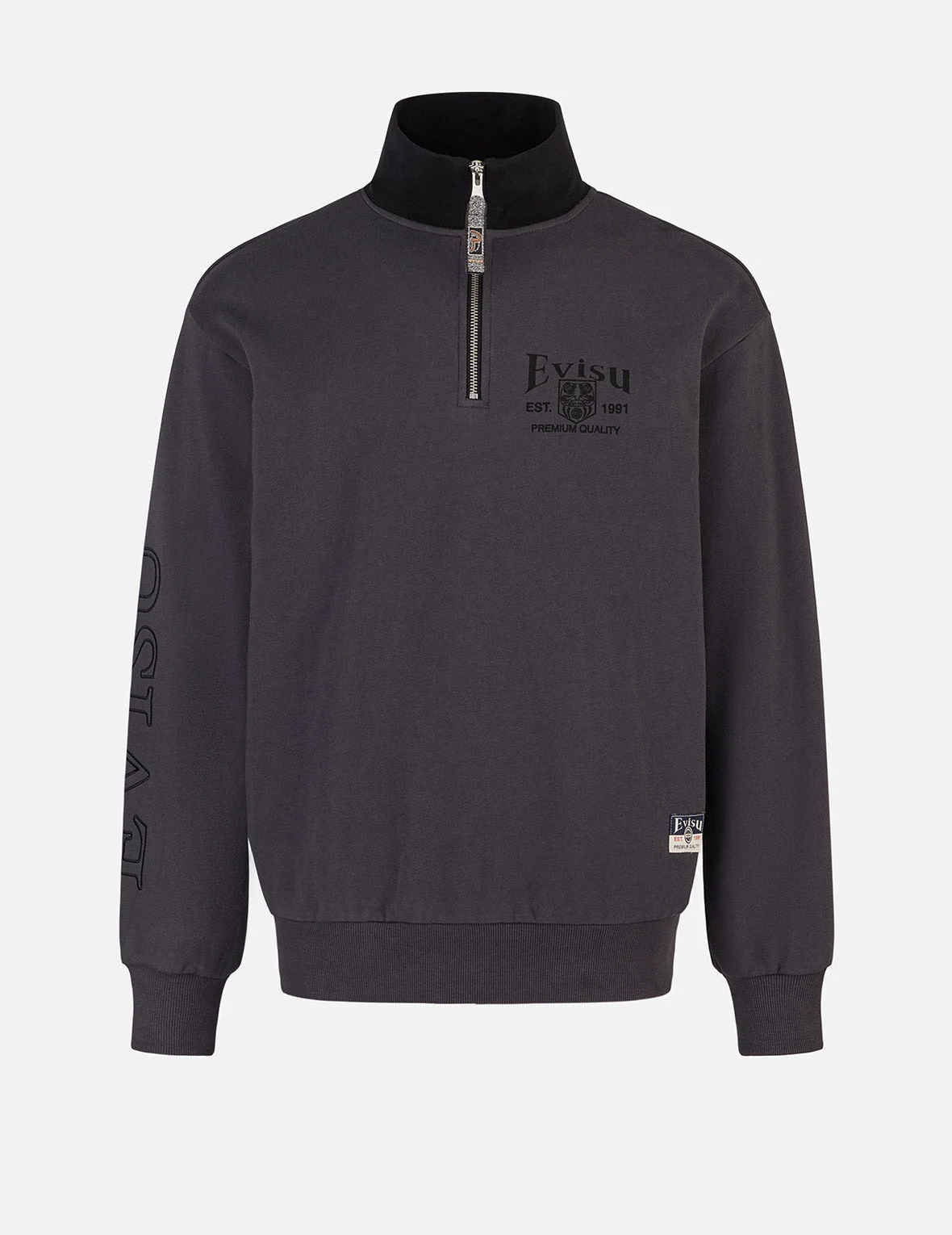 2EAHTM4SW1064RXCT Inject a dose of contemporary cool into your casual wardrobe with this relaxed-fit half-zip sweatshirt. Boasting a sleek EVISU logo embroidered subtly on the side, the eye-catching highlight is the distinctive seagull zipper tape at the neckline. This signature detail lends a touch of brand personality while ensuring practical comfort. FIT & STYLING: RELAX CARE MACHINE WASH COLD INSIDE OUT DELICATE CYCLE DO NOT BLEACH HANG DRY ONLY COOL IRON ON REVERSE SIDE IF NEEDED STEAM IRONING MAY CAUSE IRREVERSIBLE DAMAGE DO NOT DRY CLEAN DO NOT IRON ON PRINT