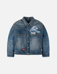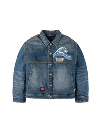 2EAMSM5DJ6400RXDQ This EVISU x MOOSE KNUCKLES quilted padded denim jacket seamlessly blends heritage denim craftsmanship with exceptional winter warmth, making it an ideal companion for the cold season. The vintage-washed fabric reveals delicate whiskering details, offering a refined yet soft texture that is both durable and rich in retro character while remaining highly wearable in modern styling. Across the chest and back, intricate high-density 3D embroidery depicts the iconic ukiyo-e wave motif—echoing front to back, symbolizing the harmonious bond between fishermen and the sea, as if narrating timeless stories. The MOOSE KNUCKLES lettering is artfully integrated into EVISU’s signature seagull emblem, infusing elegance and warmth into every detail, transforming the piece into a true one-of-a-kind work of art. - Relaxed fit - Body fabric: 100% Cotton, Lining: 100% Polyester - Co-branded logo, seagull, and wave embroidery - Button-front closure with 2 pockets - EVISU x MOOSE KNUCKLES woven label