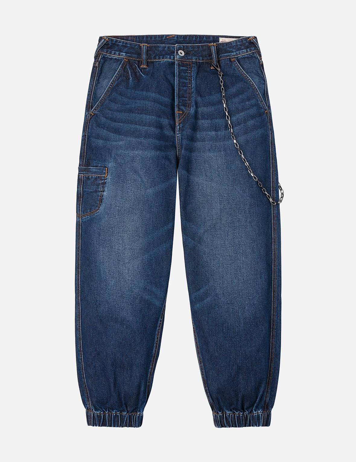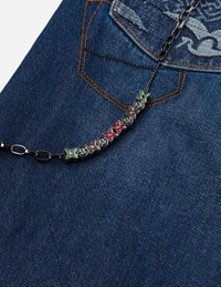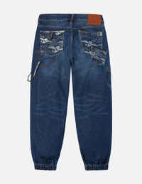 2EAHTM5JO1077LFDN These denim joggers feature a washed effect, with practical multi-pocket designs adorned with Seagull crane patterns. In addition to the pants themselves, EVISU has specially paired them with metal and woven accessories, enhancing the overall fashion sense and attention to detail, showcasing the brand's dedication and creativity. - Loose fit - 100% Cotton - Washed - Seagull crane print - Zip fly, Multi-pocket
