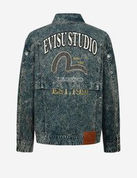 2EAHTM4DJ1006FFDN Utilizing acid wash techniques, this denim jacket by EVISU showcases a unique washed effect. The front of the jacket is adorned with a brand logo and Seagull embroidery, along with a logo print. The back features additional brand logos, seagulls, and slogan prints. Buttons at the cuffs can be undone, adding a stylish and distinctive touch. - Fashion fit - 100% Cotton - Brand logo and seagull embroidery - Brand logo, Seagulls and slogan prints - Acid-Wash - Button fastening, 4 pockets - Godhead leather patch