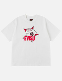 2ESHTM6TS1235RXCT Step into the high-stakes world of style of the Poker series with this T-shirt that boldly displays a full Aces poker card graphic, highlighted by a flocked star symbolizing aces up your sleeve. EVISU's iconic seagull is masterfully integrated into the classic card aesthetic. Paired with the EVISU logo, it's an essential piece for street-style enthusiasts chasing a winning look. - Relaxed fit - 100% Cotton - Aces seagull poker graphic with flocked oversized star - Crew neck, short sleeves