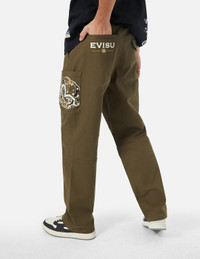 2EAHTM4PT7046RXCT These woven pants feature Seagull and EVISU embroidery on the sides, with brand logo embellishments on the back. The overall design is stylish and distinctive, showcasing a unique brand identity. - Relax fit - 98% Cotton, 2% spandex - Seagull and logo embroidery - 5 pockets, zip fly - Custom Made EVISU Heritage tag