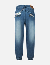 2ESHTM5JO1065LFDN Featuring seagull, logo, and slogan prints, these wide-leg denim joggers exude a distinctive urban style. The detachable metal chain adorned with a mini jeans charm brings a fun and unique element to the design. Comfortable and fashion-forward, they’re ideal for anyone who values creativity and self-expression! - Loose fit - 99% Cotton, 1% Elastane - Seagull and logo print - Detachable mini jeans charm metal chain - Button fly, 5 pockets - Godhead leather patch