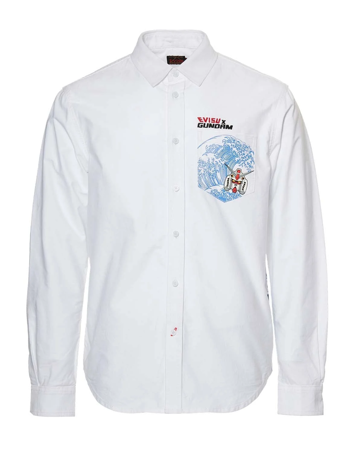 2EAGUM0SL220WV Featuring a seagull insert on the back with allover Ukio-e painting, the front panel of this crisp white shirt is peppered with RX-78-2 GUNDAM head and wave print on the chest pocket and embroidery of EVISU X RX-78-2 GUNDAM collaboration logo. Cut in regular fit for a smart casual take. - 100% Cotton - Regular fit - Long sleeves, button fastening, 1 pocket - Seagull insert, RX-78-2 GUNDAM head and wave print, EVISU X RX-78-2 GUNDAM collaboration logo embroidery - Custom Made EVISU Heritage tag - RX-78-2 GUNDAM head and quality guarantee Kanji seagull tag