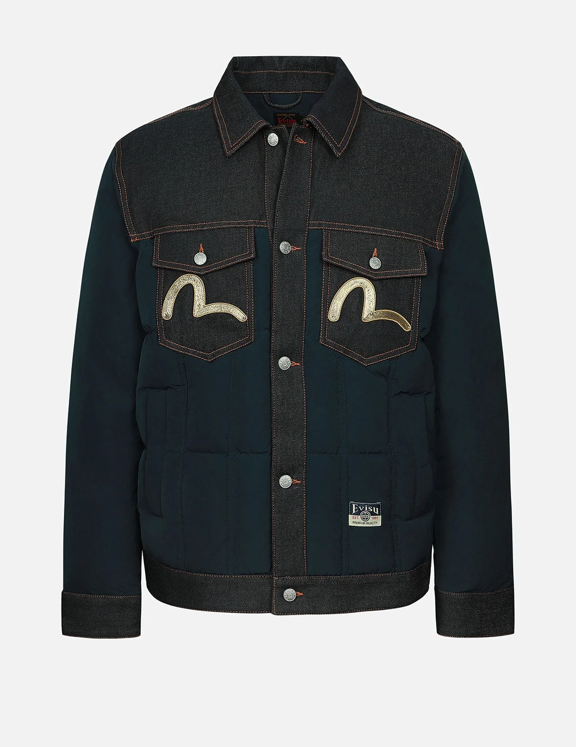 2EAHTM4NJ7035XXSN With its striking patchwork design, the EVISU denim down jacket features front pockets embellished with the brand's signature seagull metallic embroidery. Style it with a hoodie and jeans for a standout look that radiates unique character. - Regular fit - 100% Polyester - Seagull metallic embroidery - Botton fastening, 4 pockets - Godhead leather patch - EVISU Premium Quality Kamon tag