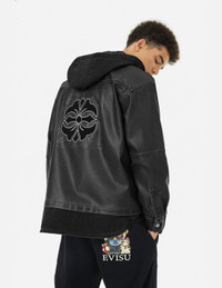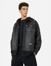 2EAHTM4JK1023XXSN This vegan leather jacket features a detachable hood, with front pockets adorned with seagull prints. The back showcases a large embossed cursive logo, presenting a unique sense of style and personality. - Regular fit - 100% Polyethylene - Seagull print and embossed cursive logo - Detachable hood - Button fly, 5 pockets