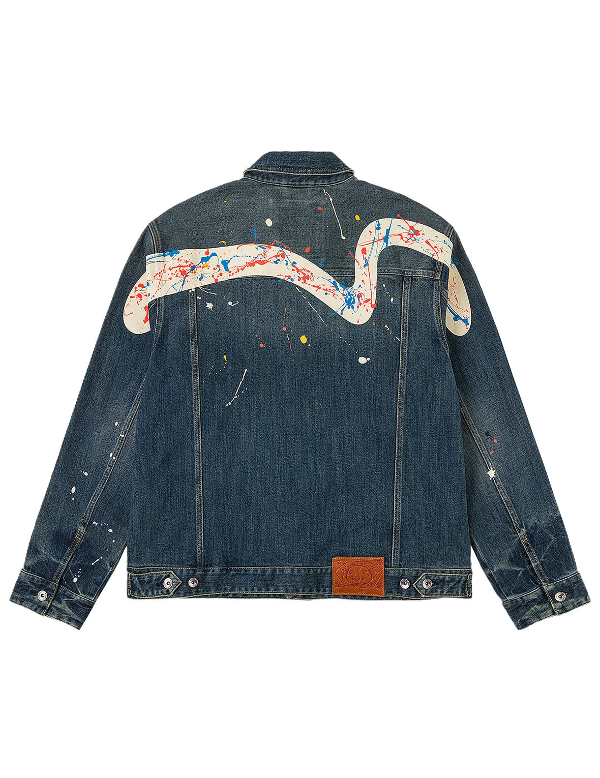 2ESHTM6DJ1010RXDN This denim jacket takes EVISU’s signature branding into a raw, artistic street aesthetic. Featuring the iconic Daicock print across the back with a creative paint‑splash effect, the brushstrokes embody the brand’s playful and creative essence. - Relaxed fit - 97% Cotton, 2% Polyester, 1% Elastane - Seagull and Daicock print with splash effect - Button fastening, 3 pockets