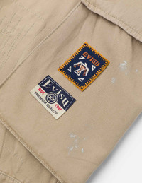 2ESHTM5PT1130STCT Introducing these straight-leg work pants that fuse totem-inspired elements with the brand's superior craftsmanship. The vintage wash, combined with various worn effects, showcases casual stitching details and patchwork. The hand-painted ink accents infuse the pants with a fashionable edge, perfect for those who value individuality. - Straight fit - 100% Cotton - Totem seagull embroidery, patch, hand-splashed ink design - Zip fly, 6 pockets - Thunderbird Ethnic Totem Tags - EVISU Premium Quality Kamon tag