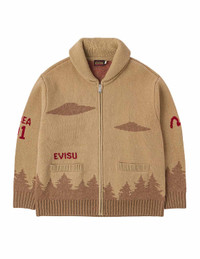 2EAEJM5CN6034RXWL This knitted sweatshirt features the new series' UFO and Cowichan intarsia patterns, complemented by contrasting logos and EVISU elements. It showcases a unique design, making it a fashion piece full of personality and creativity. - Relax fit - 100% Wool - UFO and Cowichan intarsia patterns - Zip fastening, 2 pockets