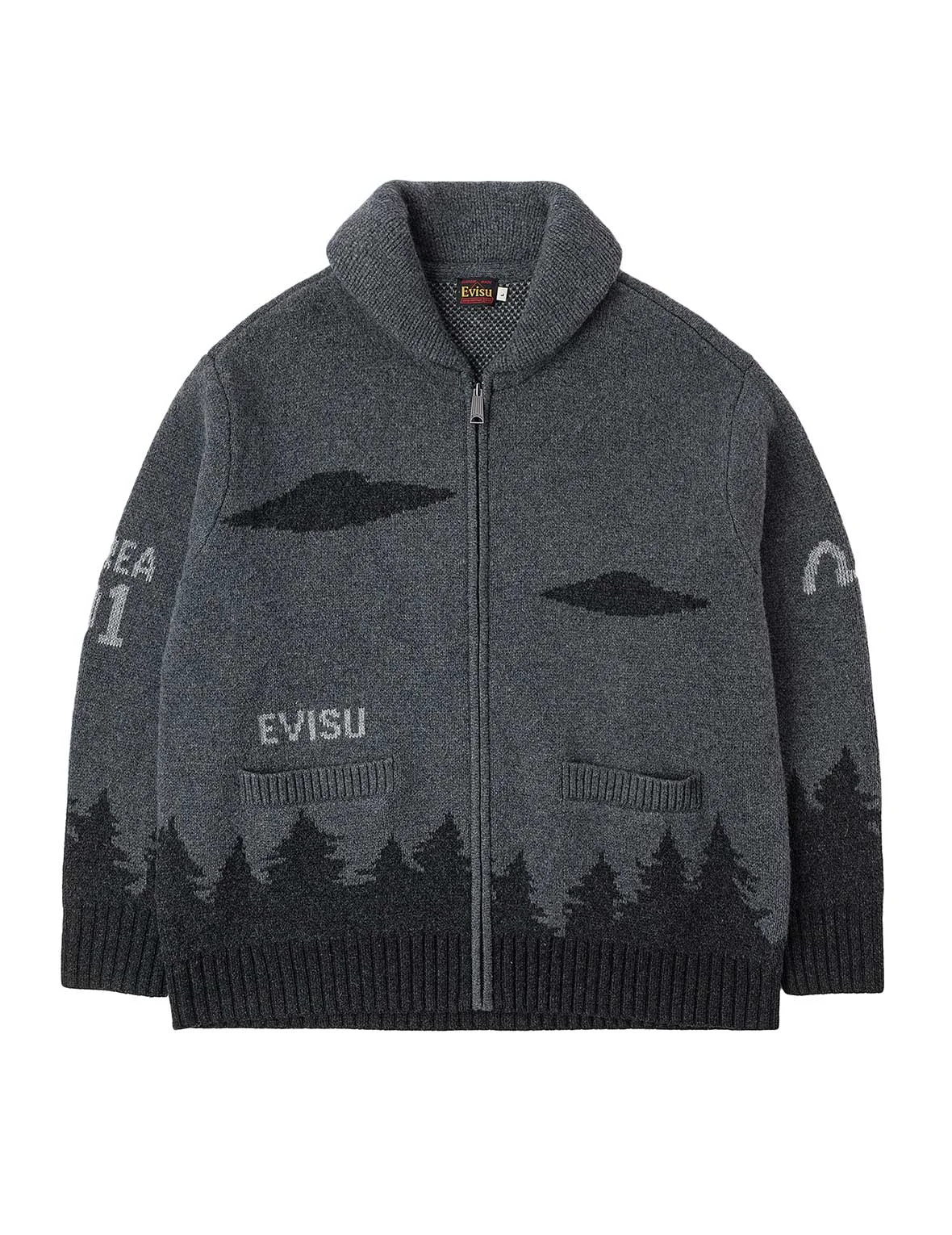 2EAEJM5CN6034RXWL This knitted sweatshirt features the new series' UFO and Cowichan intarsia patterns, complemented by contrasting logos and EVISU elements. It showcases a unique design, making it a fashion piece full of personality and creativity. - Relax fit - 100% Wool - UFO and Cowichan intarsia patterns - Zip fastening, 2 pockets