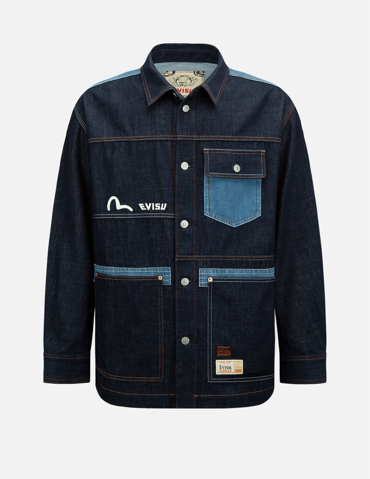 2ESHTM2SJ720LFDN Made from weighty denim blocking in various shades, this loose-fit shirt jacket is highlighted with chain-stitched handwritten logo, brand motto and Godhead embroidered badge on the back, while the front panel is punctuated by functional deep pockets to channel industrial essence. - 10oz rinsed denim - Loose fit - Fabric blocking design - Vintage handwritten logo, brand motto, seagull and EVISU logo embroidery, Godhead badge - Button fastening, long sleeves, 3 pockets - Godhead leather patch - 100% Cotton
