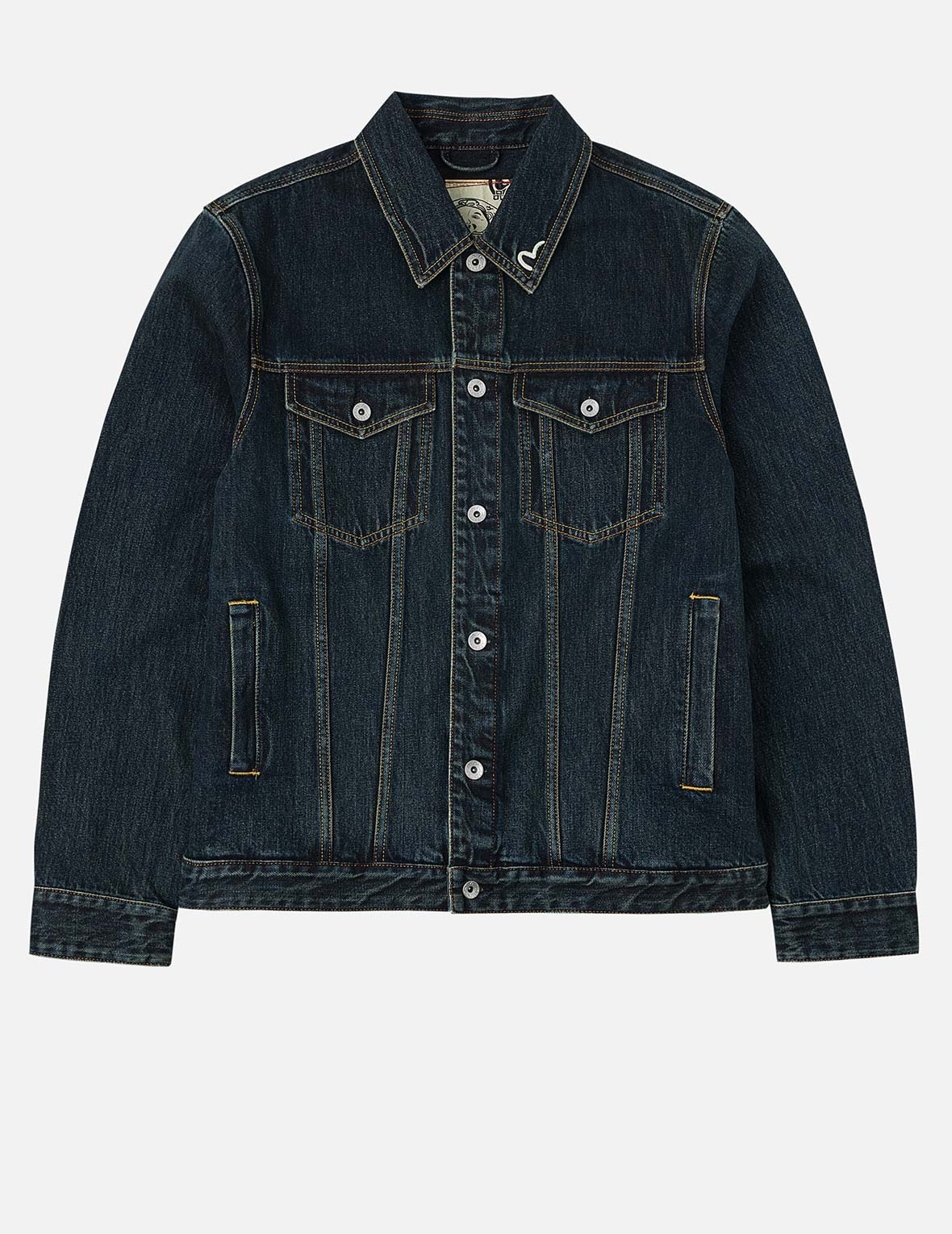 2EAHTM5DJ1003XXDN This denim jacket from the curated collection exudes a unique, avant-garde charm and irresistible allure! Crafted with expert Japanese wash techniques, the fabric boasts a vintage, natural feel, infused with the distinctive texture of aged elegance. The bold, expressive brushstroke Daicock print on the back leaps out with artistic flair, instantly igniting street fashion trends and commanding attention. Wear it to transform into a trendsetting icon of street style, unleashing your own distinctive personality! - Regular fit - 100% Cotton - Washed effect - Brushstroke Daicock print - Button fastening, 4 pockets - Godhead leather patch