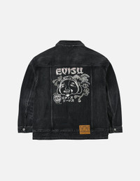 2EAHTM5DJ1023OSDN This EVISU Chinese-style denim jacket is crafted from washed black denim, featuring a relaxed fit that exudes avant-garde flair. The back is adorned with a striking Godhead embroidery, complemented by iconic trademark and Kamon accents, showcasing a unique artistic vibe. The design shines with the exquisite integration of traditional Chinese button details, paired with a zipper closure, blending heritage craftsmanship with modern functionality to create the ultimate statement piece that fuses Eastern charm with streetwear edge! - Oversized - 100% Cotton - Godhead, Logo and Kamon embroidery - Chinese Button and zip fastening, 3 pockets - EVISU Premium Quality Kamon tag - Godhead leather patch