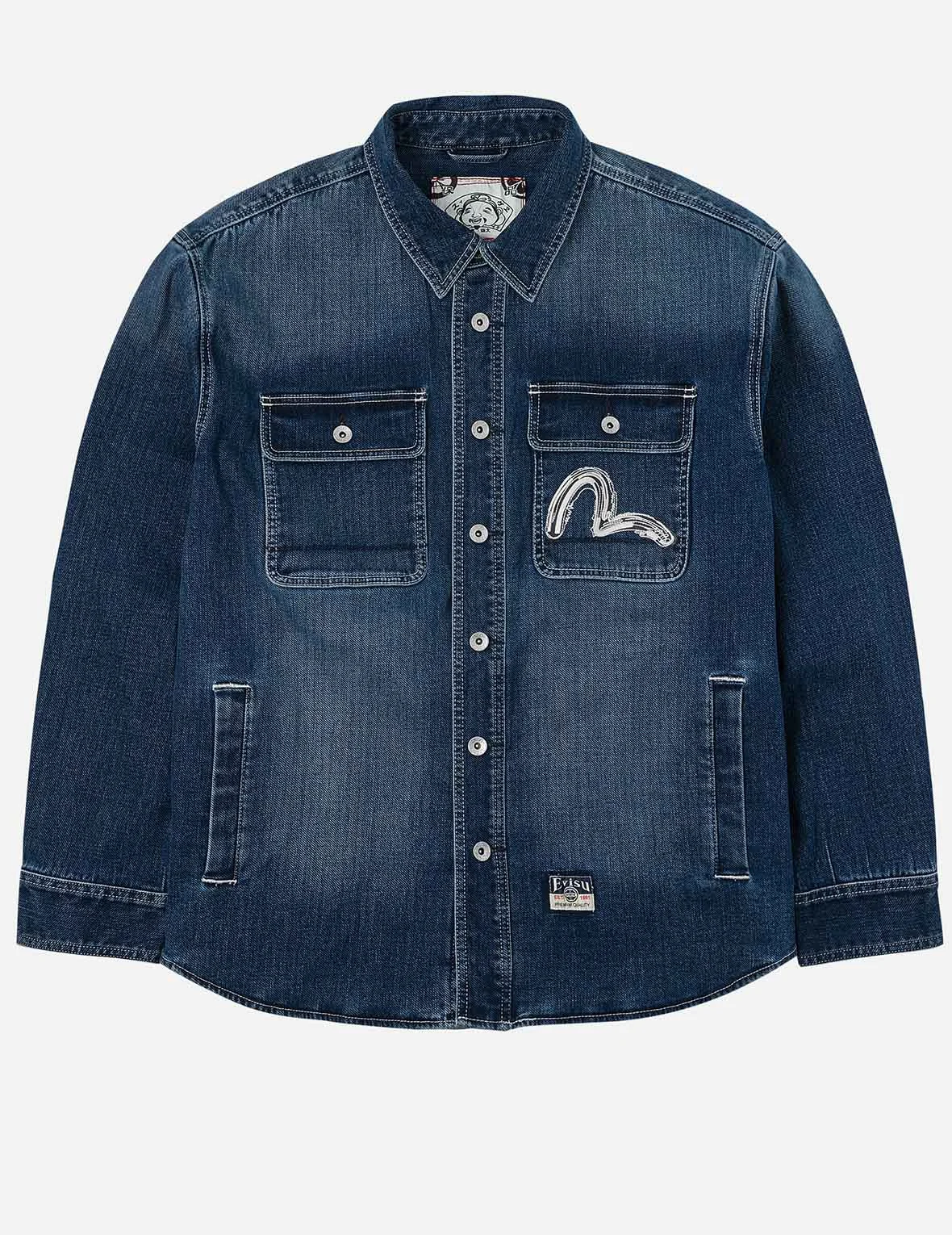 2EAHTM5SJ1040XXDN This shirt jacket embodies a rebellious avant-garde aesthetic! Enhanced by wash techniques and Japanese processing, it offers a natural, carefree texture with a rich vintage vibe. The blend of a relaxed wide-fit silhouette and classic cut creates a distinctive street-ready aura. Hand-stitched seagull embroidery on patched pockets ignites artistic details, letting you wear your own trendsetting statement! - Regular fit - 60% Cotton, 28% Polyester, 10% Lyocell, 2% Elastane - Washed effect - Seagull embroidery - Button fastening, 4 pockets - EVISU Premium Quality Kamon tag